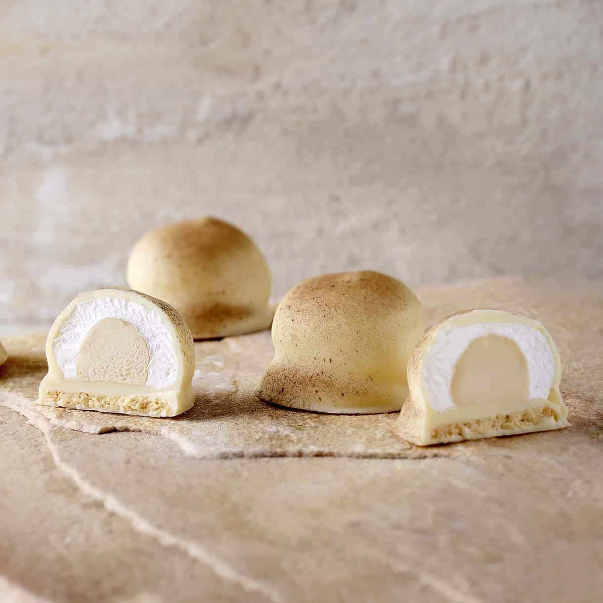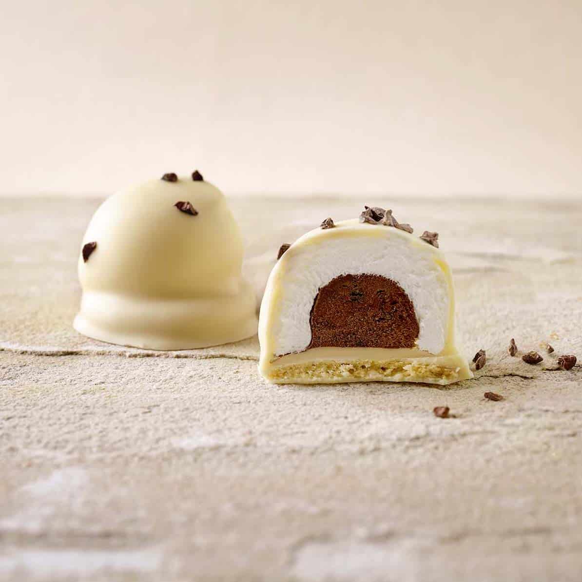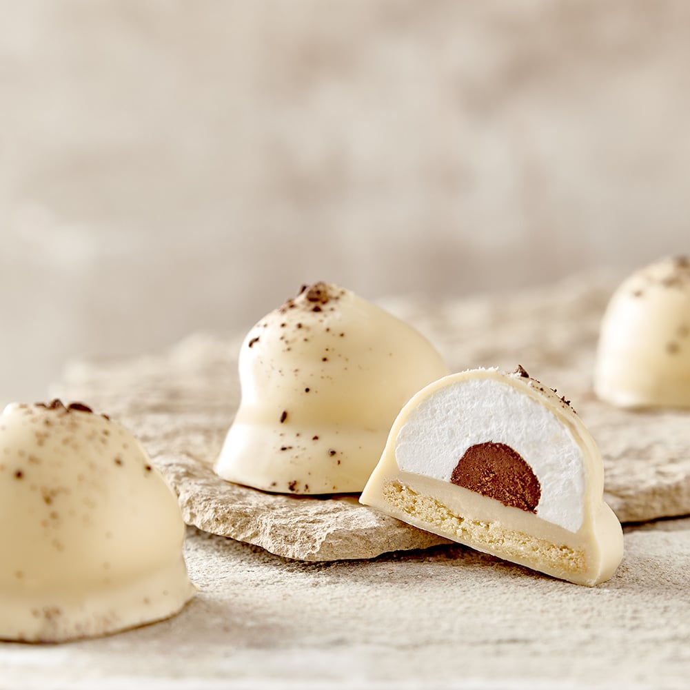 Zachte vanille marshmallow op een klassieke koffiebotercrème, gedompeld in witte chocolade verkrijgbaar het ganse jaar door
