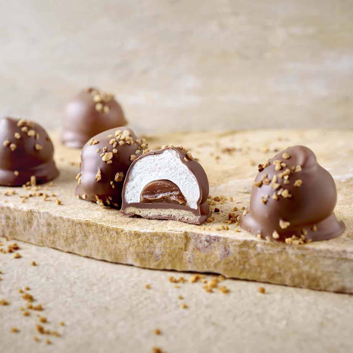 Zachte vanille marshmallow op een huisgemaakte caramelvulling met fleur de sel gedompeld in melkchocolade, afgewerkt met brésiliennenootjes verkrijgbaar het ganse jaar door