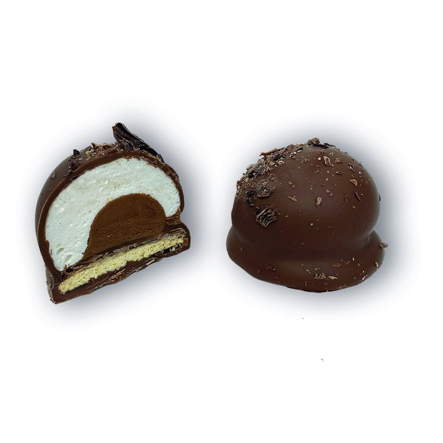 Zachte vanille marshmallow op laagje giandujapraliné, gedompeld in melkchocolade of fondantchocolade, afgewerkt met donkere hagelslag verkrijgbaar het ganse jaar door